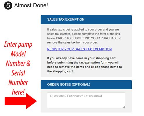 Request a Prepaid Label: During checkout, enter the model number and barcode serial number of your old pump in the Order Notes section in Step 5 of the checkout page to qualify (see image on right). You must request the label at the time of order.