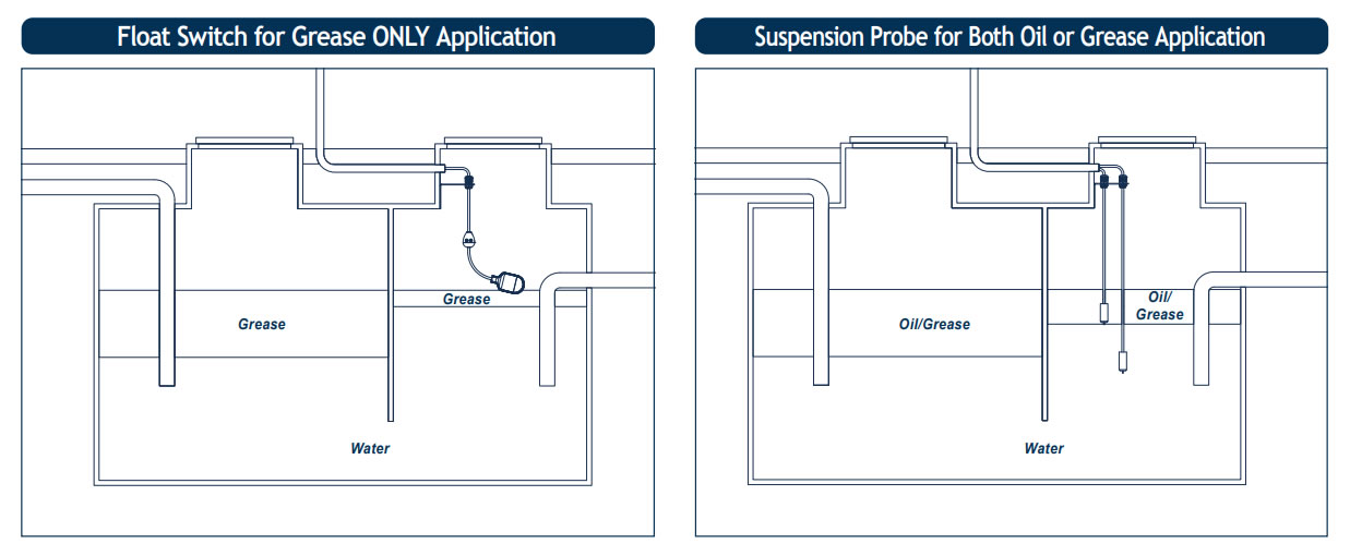 The GOOP Alarm system from Alderon can provide notification via suspension probes in the grease trap or oil separator attached to the alarm panel. One suspension probe is placed for reference and a second probe is used to detect the grease or oil level on top of the water.
