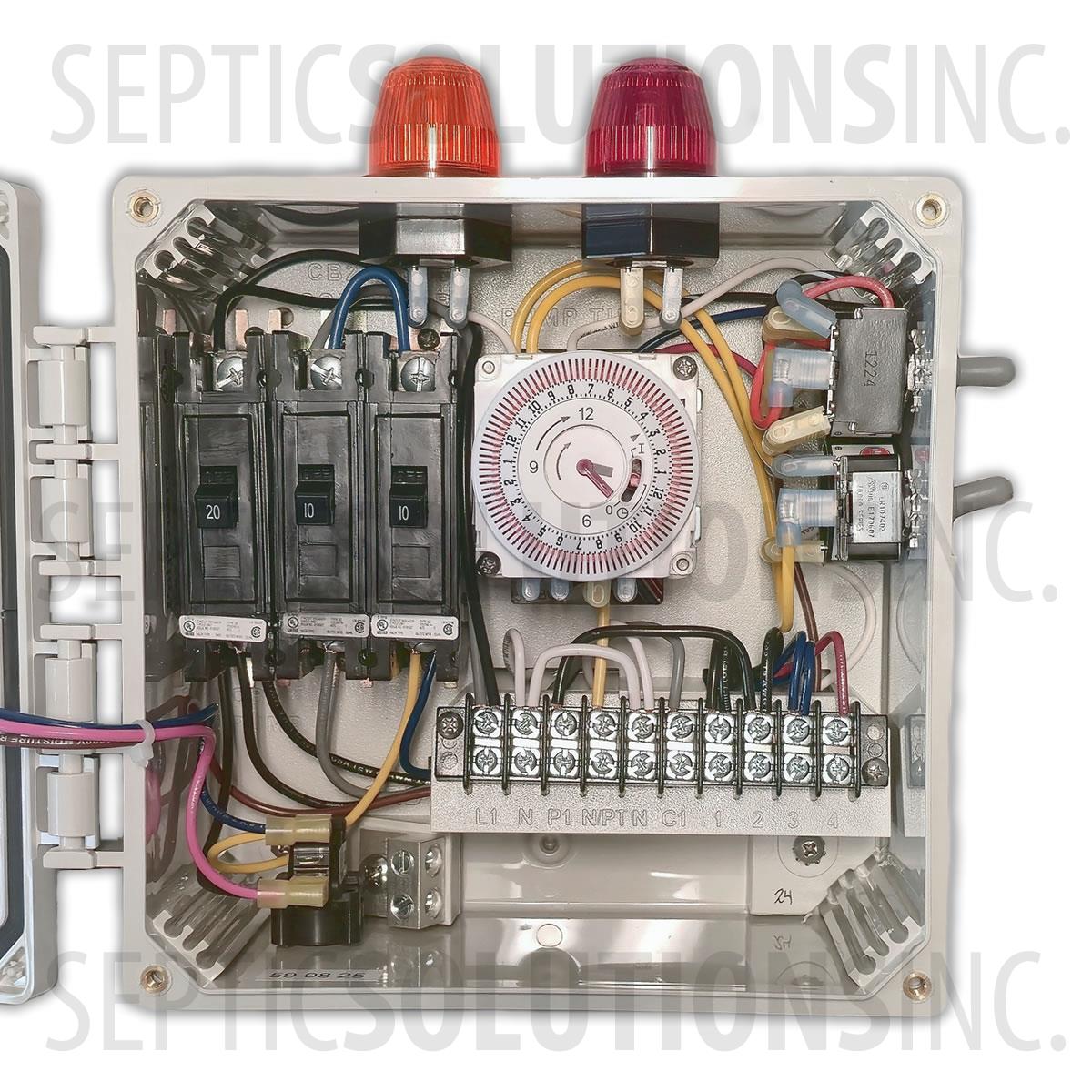 The BIO-A panel is critical for aerobic systems that rely on both aeration and timed effluent dispersal. The air pump oxygenates the tank to support waste-breaking bacteria, while the submersible pump, controlled by the timer, distributes treated effluent to irrigation or secondary systems. Dual alarms provide early warnings—high water indicates potential pump or system issues, while air pump failure signals aeration loss, which could lead to anaerobic conditions and untreated effluent within two weeks.