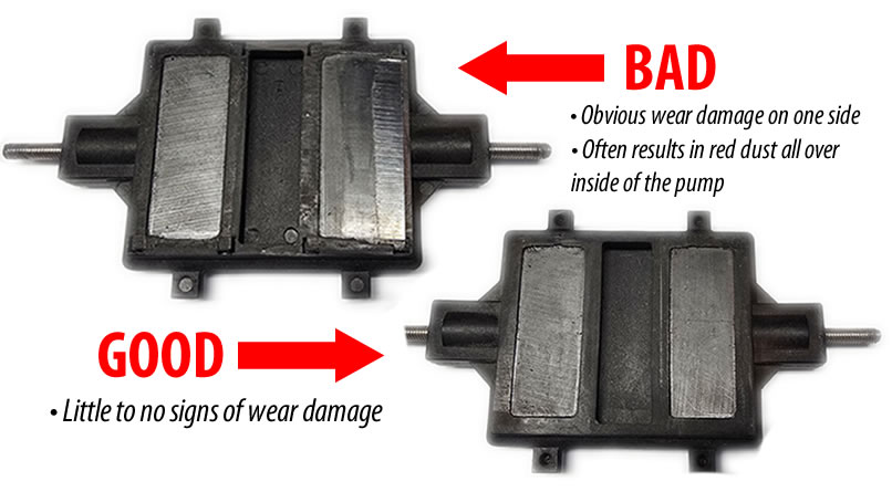Failure of the magnetic rod block is uncommon compared to diaphragm issues (which cause 80-90% of pump stoppages), but it can make the pump irreparable if ignored. Pumps last 8-12 years with maintenance, but the rod block may need checking during rebuilds every 3-6 years.